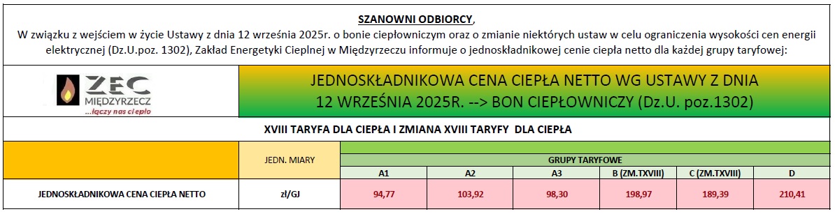 W związku z wejściem w życie Ustawy z dnia 12 września 2025r. o bonie ciepłowniczym oraz o zmianie niektórych ustaw w celu ograniczenia wysokości cen energii elektrycznej (Dz.U.poz. 1302), Zakład Energetyki Cieplnej w Międzyrzeczu informuje o jednoskładnikowej cenie ciepła netto dla każdej grupy taryfowej.