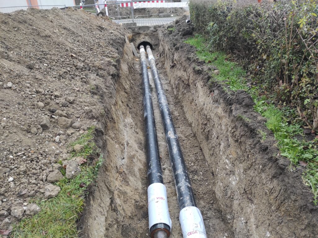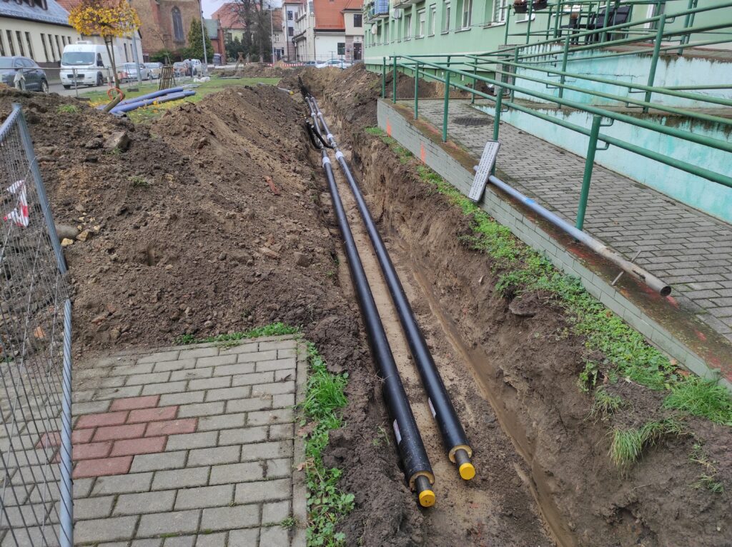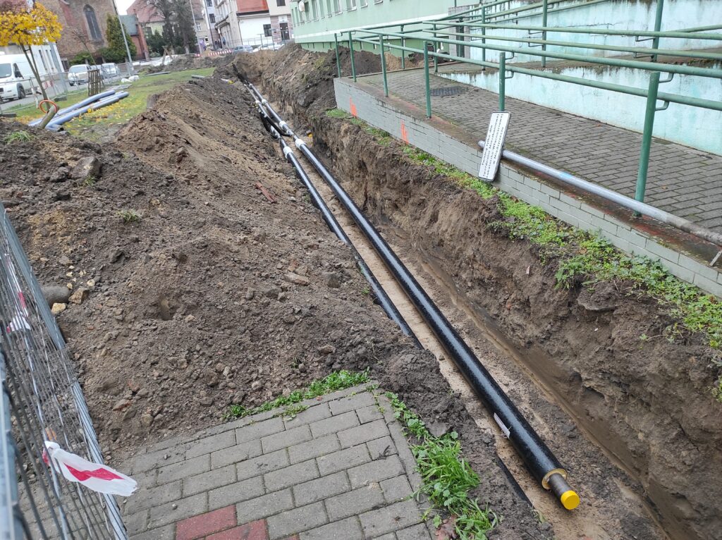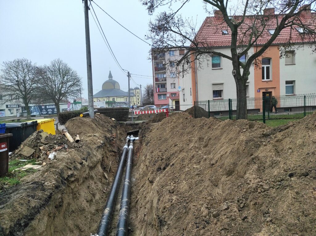 - ul. Spokojna / Os. Centrum – modernizacja sieci kanałowej DN50/125 i DN80/160 o długości 2×77 m i 2×75 m na nową sieć preizolowaną. Fragment łączy budynki Os. Centrum 13–14, Spokojną 3 oraz plebanię parafii pw. Św. Jana Chrzciciela.